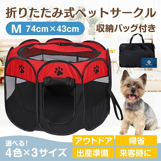商品名:HinaHima 折りたたみ式 ペットサークル 収納バッグ付き 組み立て不要 猫 犬用 ケージ 幅74cm×高さ43cm (M, レッド)