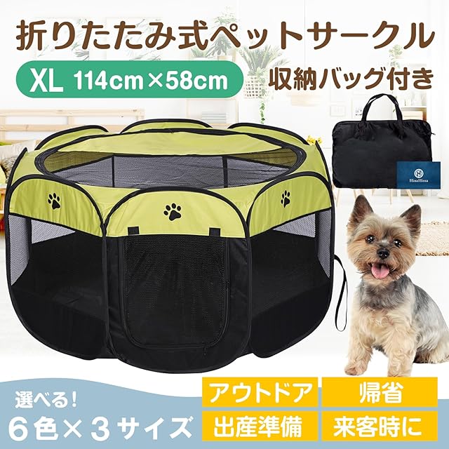 商品名:HinaHima 折りたたみ式 ペットサークル 収納バッグ付き 組み立て不要 猫 犬用 ケージ 幅114cm×高さ58cm (XL, イエロー)