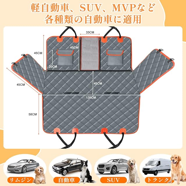 【アップされ5層素材構造】前の2層素材より犬 ドライブシート素材は5層構造を改良しました。600D防水オックスフォード+PV 防水膜+80gコットン+210Dの裏生地++滑り止めネットを採用しております。本体素材は防水性、耐摩耗性と耐傷性あり、ドライブ途中で犬がおしっこをしても水が染み込まず、雨や雪の日でも座席をしっかりカバーして、汚れや犬のひっかき傷、毛、泥などの損傷からご愛車を解放します。