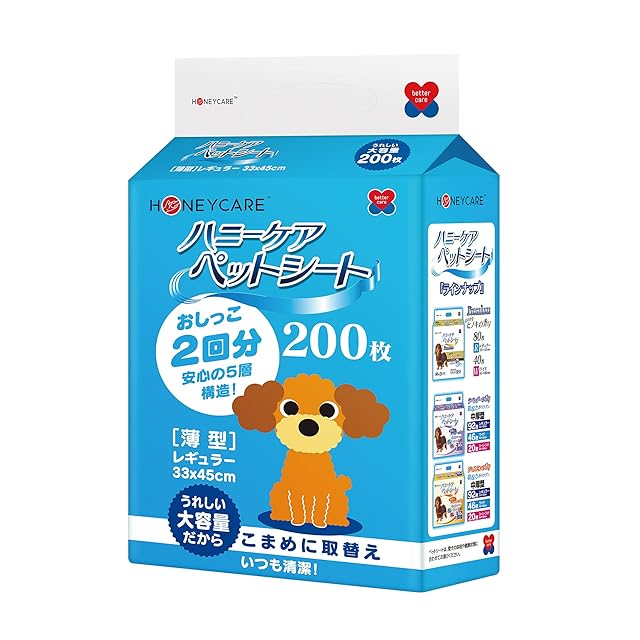 1 本商品「ハニーケア ペットシーツ」は薄型ですが、多層構造を採用したため、オシッコをたっぷり吸収いただけます。 2 レギュラー・ワイド・スーパーワイドで3つのサイズを用意したので、小型犬(子猫)から中型・大型犬までに対応いただけます。 3 瞬間吸収・逆戻りにくい・におわない・高品質原材料などの革新的な技術で品質グレードをアップいたします。 4 こだわりの多層構造でオシッコを吸収し、しっかりとキープするため、漏れにくくなります。 5 お得な大容量のため、一枚当たりの単価が安くて、気軽に使用しやすいでございます。