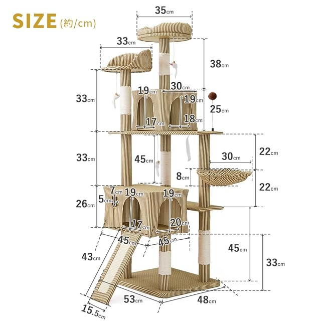 AIFY キャットタワー 据え置き スリム 大型猫 大型 中型 多頭飼い ハンモック おしゃれ かわいい 爪とぎ おもちゃ 猫タワー ねこ 安定 頑丈 爪研ぎ 麻紐 子猫 シニア 省スペース ファブリック素材 夏 オールシーズン 年中使える 170cm ストライプブラウン