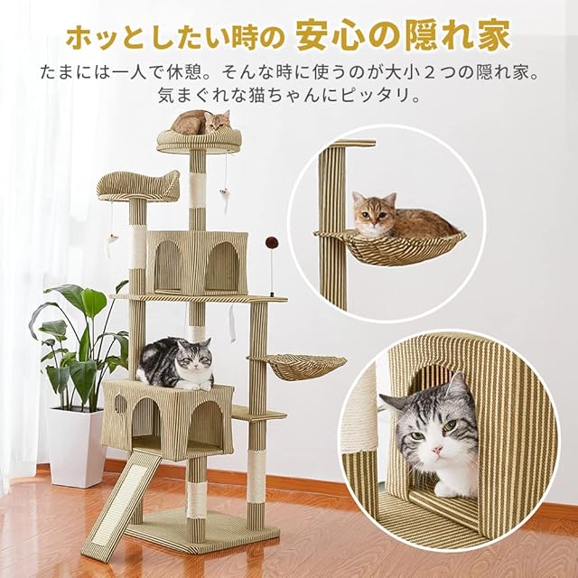 商品名:AIFY キャットタワー 据え置き スリム 大型猫 大型 中型 多頭飼い ハンモック おしゃれ かわいい 爪とぎ おもちゃ 猫タワー ねこ 安定 頑丈 爪研ぎ 麻紐 子猫 シニア 省スペース ファブリック素材 夏 オールシーズン 年中使える 170cm ストライプブラウン
