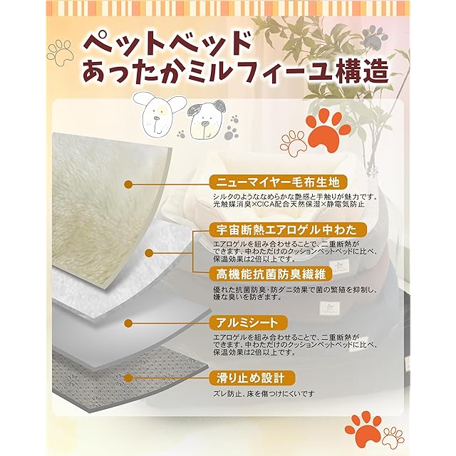 【断熱革命・爆速の暖かさ】猫 犬 ベッドの内側には日本伝統的な毛布織り方「ニューマイヤー」生地を使用しており、自然由来のコーヒーファイバー素材を採用されています。さらにベッドの詰め物には革新的な発熱繊維わたと革命的な断熱素材アエロゲル繊維+アルミシートのW断熱構造で爆速の暖かさを実現した、極寒時期には至福のあったかペットベッドです。