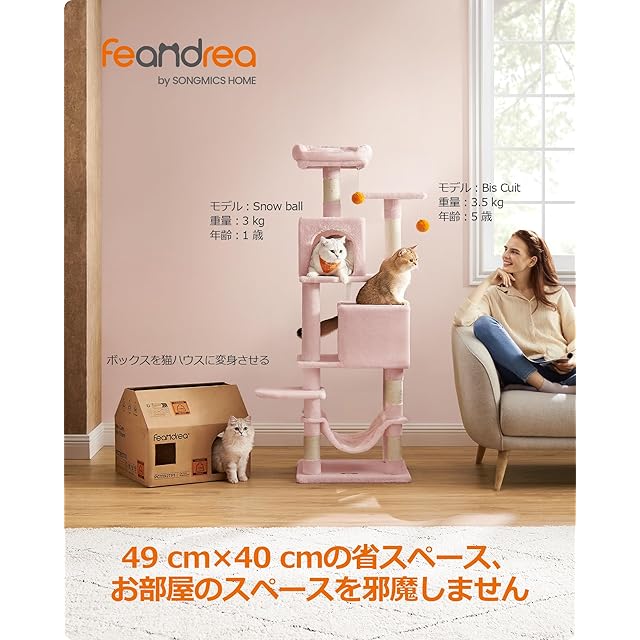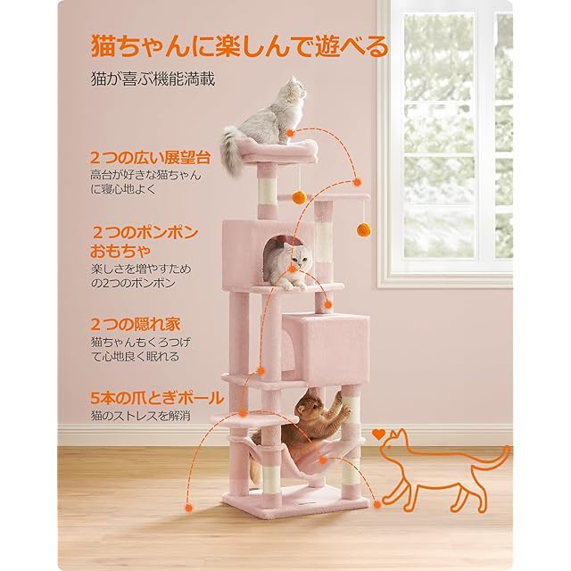 商品名:FEANDREA キャットタワー スリム 猫タワー 大型猫 多頭飼い 据え置き 省スペース ハンモック付き 爪とぎ 運動不足解消 高さ155CM ピンクPCT192P01