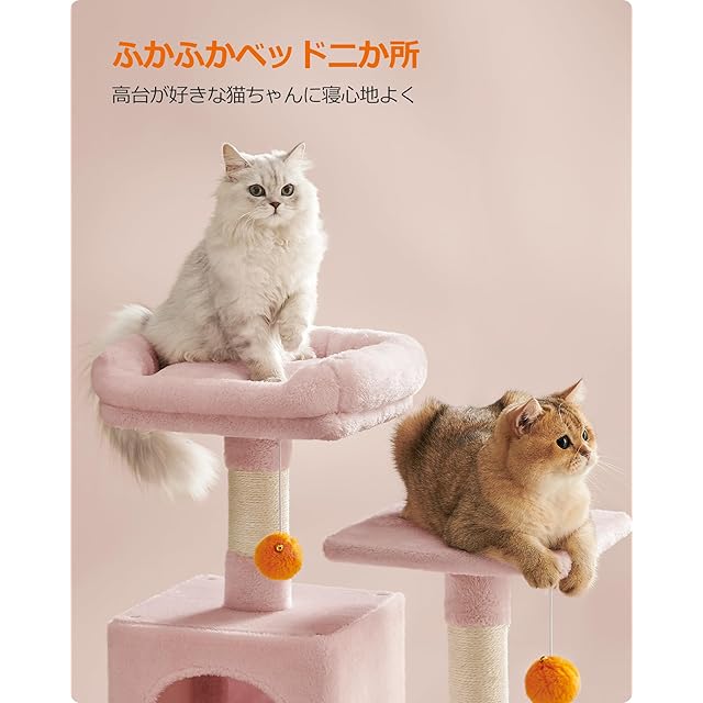 【遊べるポイント満載】フワフワな広い見晴らし台、にゃんこ心をくすぐるポンポン、すやすや眠れる隠れ家、ガリガリできる支柱、猫ちゃんが喜ぶ機能いっぱいなキャットタワーです