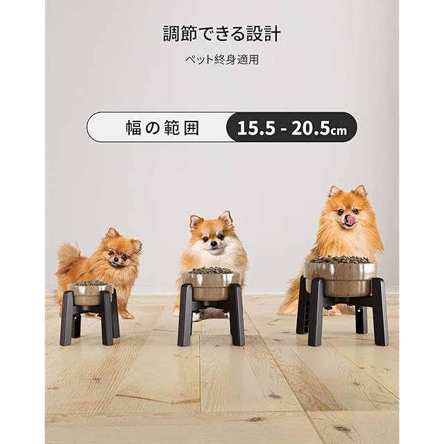 【幅が調節可能】今市販しているスタンドのほとんどは、調節できません。しかし、JUNSPOWフードボウルスタンドは、幅15.5~20.5cmの調節が可能です。つまり、あらゆる形やサイズの食器に適しています。 また、簡単に調整できるように設計されています。 JUNSPOWのスタンド1つだけで、あなたの大切なペットの各成長段階に十分付き合えます。