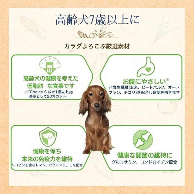 ・高齢犬の健康を考えた低脂肪な食事です(「ChoiceS成犬1歳以上に」を基準として20%カット)。