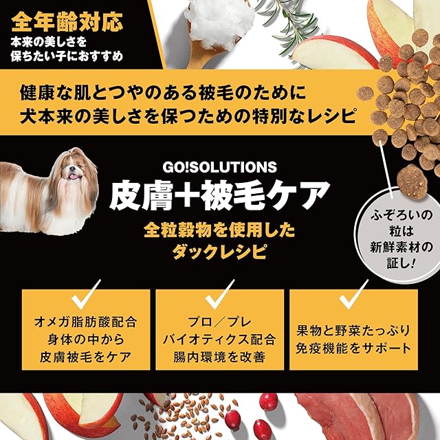 商品名:【毛並みのお悩みに】GO! SOLUTIONS 皮膚+被毛ケア ドッグフード 800g ダック 全粒穀物 玄米 フルーツ 全年齢 全犬種 [ゴーソリューションズ]