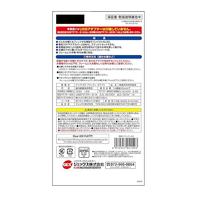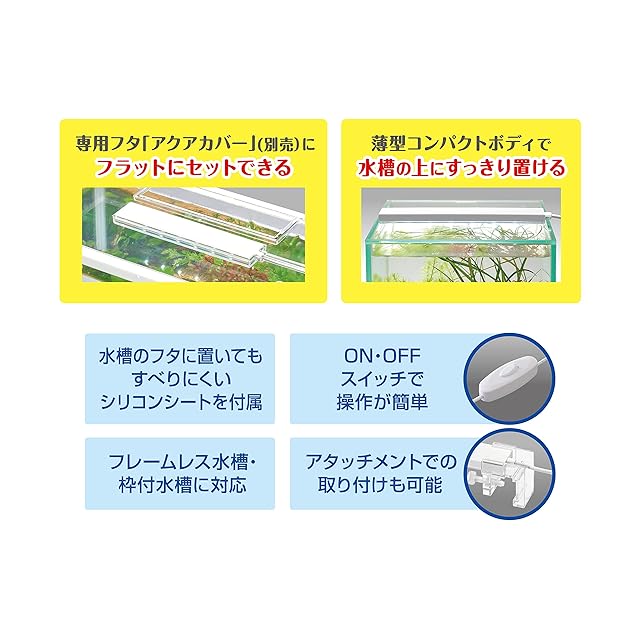 コンパクトで明るいスリム高輝度LED。厚さ8mm超コンパクトスリムボディ。水景を鮮やかに照らす自然の明るさで魚や水草を美しく魅せる。明るさ130lm、色温度6,800K、演色性Ra83。置き方自由自在!専用フタ「アクアカバー」(別売)でフラットにセット。水槽のフタに置いてもすべりにくいシリコンシート付で、フレームレス水槽にすっきり置ける。フレームレス水槽・枠付水槽に対応。コンパクト水槽用、幅40cm以下の水槽に最適。ON・OFFスイッチで操作が簡単。アタッチメントでの取り付けも可能。USB電源を採用。本製品にはUSBアダプターは付属していません。当社純正品(USBアダプターG-1A)もしくは市販のUSBアダプター(DC5V 1A以上)をお買い求めください。