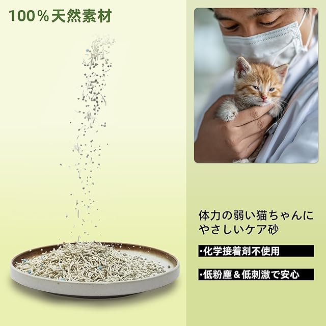 1.【100%天然素材|体力の弱い猫のためのケア用猫砂】 100%食用レベルの天然植物由来素材を使用し、安全性試験も実施済み。少量を誤って口にしても問題ありません(※ただし、フードとして大量に摂取させないでください)。本製品は、幼猫・高齢猫・療養中または体力が低下した猫のために特別に設計されたケアタイプの猫砂です。 鉱物系猫砂(ベントナイト 猫砂)は粉塵や化学成分を多く含み、誤食時に胃腸への刺激が懸念されます。また、紙製や木製の猫砂も、使用される接着剤の安全性に不安が残ります。 Zutto Nyanのキャッサバミックス猫砂は、化学接着剤を一切使用せず、低粉塵かつ刺激性も極めて低いため、体調の変化に敏感な猫ちゃんにも安心してご使用いただけます。