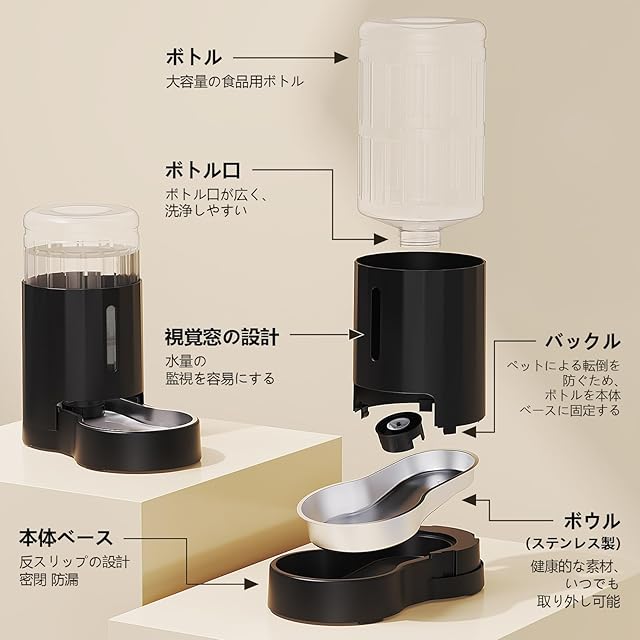 商品名:JUNSPOW 6Lペット給水器, 重力式大容量ステンレス製給水器,100%BPAフリー自動ペット給水器、猫と小型/中型犬用 ブラック