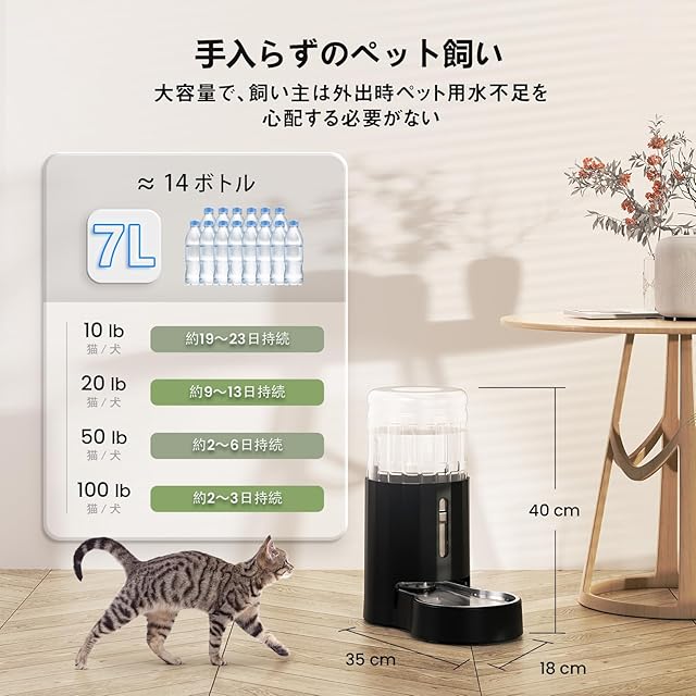 商品名:JUNSPOW 7L 大容量ペット給水器 ステンレスボール付き 自動給水器 水飲み器 留守対応 ブラック 多頭飼い 中型小型犬猫用 ペットボトル