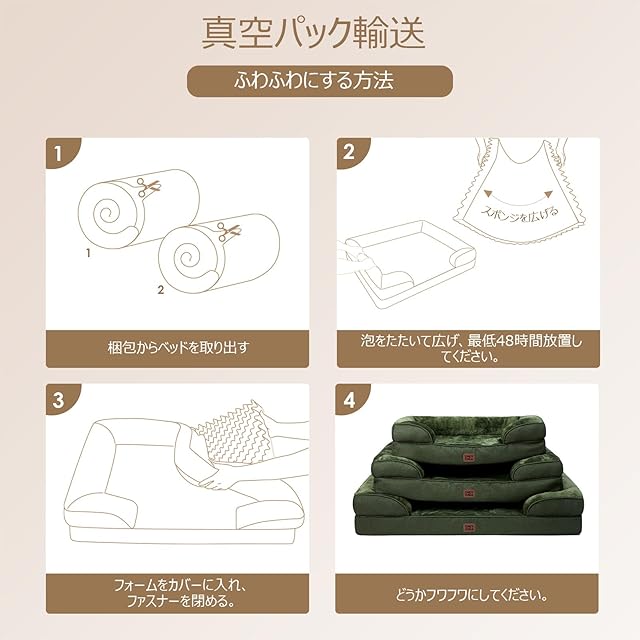 お手入れ方法:当社の犬用ベッドには、取り外して洗えるカバーが付いています。カバーは中材を取り外せば洗濯機で丸洗い可能です。ただし、中材のフォーム自体は洗えませんのでご注意ください。開封後は24〜48時間ほどで元の形に膨らみます。
