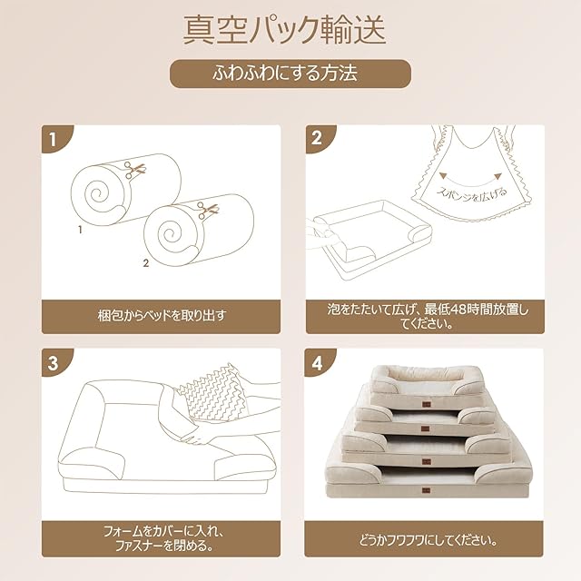 お手入れ方法:当社の犬用ベッドには、取り外して洗えるカバーが付いています。カバーは中材を取り外せば洗濯機で丸洗い可能です。ただし、中材のフォーム自体は洗えませんのでご注意ください。開封後は24〜48時間ほどで元の形に膨らみます。