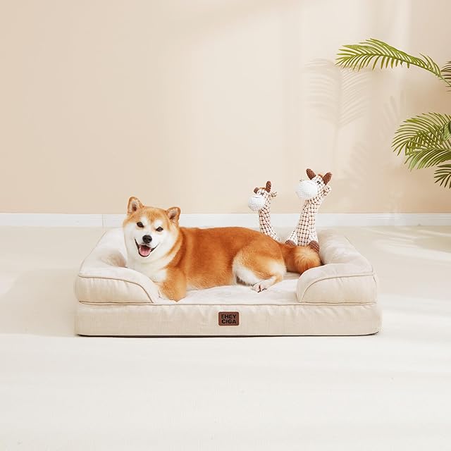 商品名:EHEYCIGA 犬 ベッド 冬 ペットベッド 防水 猫 ベッド 洗える 犬用 クッション 高反発 取り外せるカバー 滑り止め オールシーズン 中型犬 大型犬(91x68x16.5cm,ベージュ)
