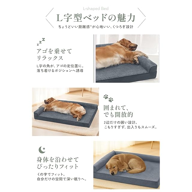 ?【おしゃれと実用性を兼ね備えた犬用ベッド】デザイン性と実用性を両立したクッション性のあるベッドです。お色はチャコールグレーとアッシュグレーをご用意。Lサイズは小型犬にもおすすめの犬用ベッドで、日常使いのペット用ベッドとして最適です!ベッドにはアゴ乗せ枕(クッション)付きで寝たきりのワンちゃんもラクな姿勢をとることができます。