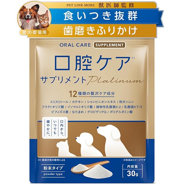 【本格口腔ケアサプリメント】PETLINKMORE 口腔ケアサプリメントplatinumは8大口腔ケアサポート成分配合の本格派口腔ケア用品。それなのにいつものごはんにさっとかけるだけ。簡単に口腔ケアできるふりかけタイプのデンタルケアです