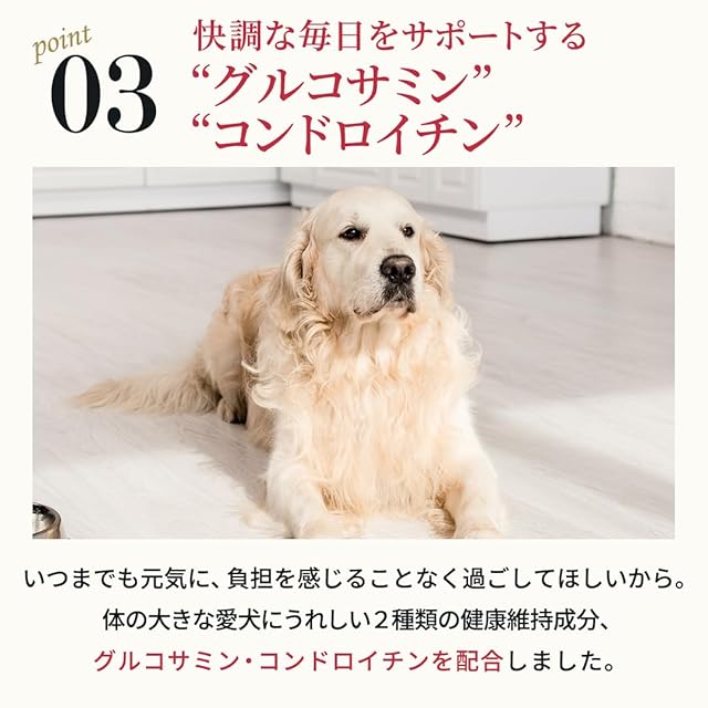 ?【快調な毎日をサポートする”グルコサミン”・”コンドロイチン”】いつまでも元気に、負担を感じることなく過ごしてほしいから。体の大きな愛犬にうれしい2種類の健康維持成分、グルコサミン・コンドロイチンを配合しました。