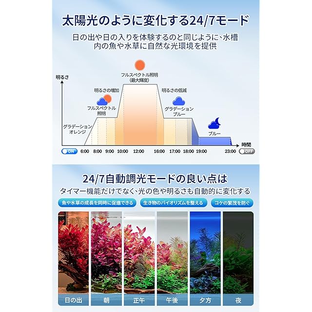 【新機能:24/7自動調光モード】 強力な照明能力に加え、便利な自動調光モード「24/7モード」を搭載しています。このモードは、日の出から月光までの自然光の変化をシミュレートし、日の出の暖かいオレンジ色の光から、正午の明るいフルスペクトルの光、そして夜の星空の青い光まで再現します。このアクアリウムライトは、水草の成長や魚の生活リズムに合わせて光をシミュレートし、自然な生活環境を再現します。さらに、一度設定するだけで、毎日朝6時に自動点灯、夜23時に自動消灯するため、非常に便利です。淡水水槽も海水水槽も美しく照らし、省エネで長寿命のLEDライトで手軽にアクアリウムを楽しむことができます。