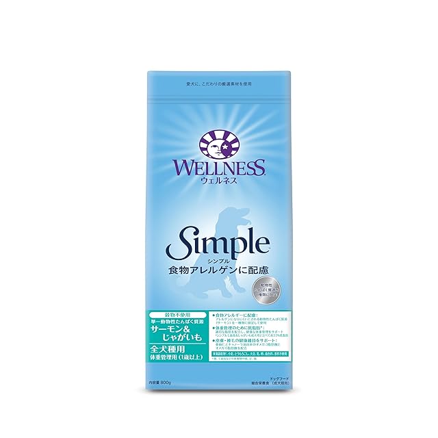 商品名:ウェルネスシンプル(食物アレルゲンに配慮 皮膚ケア グレインフリー)全犬種用体重管理用(1歳以上用)サーモン&じゃがいも800g