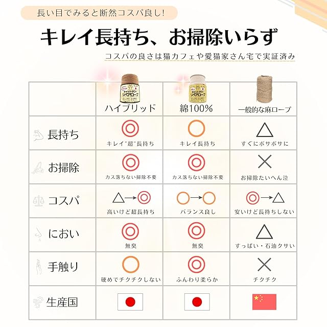 ? 【お掃除楽チン】 麻紐はネコちゃんが爪をとぐたびに繊維がポロポロ落ちて掃除が大変!このハイブリッド素材の補修ロープはカスが全く落ちないでお掃除の手間はありません。