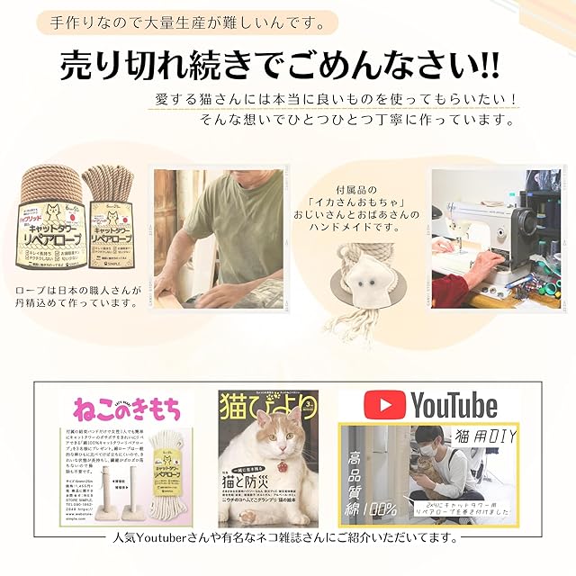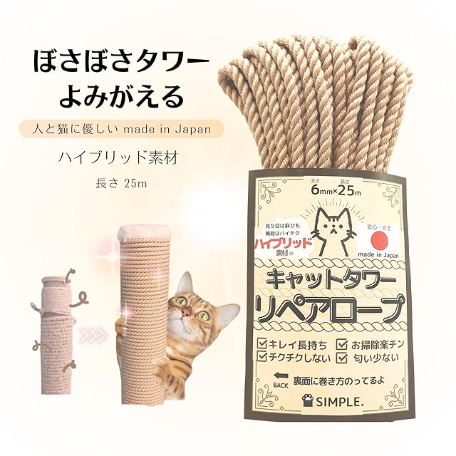 ? 【キレイ”超”長持ち】 キャットタワーの爪研ぎ部分のボサボサをDIYでキレイにしませんか?一般麻ひもに比べてモサモサしないから見た目がグッド!ボサボサになりにくいので頻繁に巻き直す必要もありません。 ? 【お掃除楽チン】 麻紐はネコちゃんが爪をとぐたびに繊維がポロポロ落ちて掃除が大変!このハイブリッド素材の補修ロープはカスが全く落ちないでお掃除の手間はありません。 ? 【人と猫に優しい】 巻く時チクチクしません!硬すぎず柔らかすぎないネコちゃんの爪を思いやり開発をしたネコちゃん専用のロープです。 ??【臭わないので安心】 ?中国製の麻ひもで嫌な匂いを経験された方も少なくないはず。 そんな方にはこの日本製の補修用ロープをぜひとも使っていただきたいです。 ??【巻き方かんたん】 ?道具不要!結束バンドだけで簡単に巻き直し可能です。結束バンドは予備も含めて4本付属します。またロープにイカヘッドさんを装着しネコちゃんのおもちゃに!