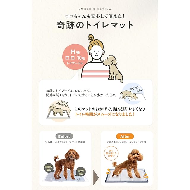 ≪獣医師監修≫いぬのくらしのシリコントイレマットは防水性が高く清掃も簡単で、食品グレードのシリコンを使用しているため安心してご使用していただけます。 また、様々なシーンで活用できわんちゃんの生活を快適にしてくれます。 シリコントイレマットを敷くことで滑りにくくなり、関節への負担も軽減されるので足腰の弱いわんちゃんやシニア犬にもお勧めです。