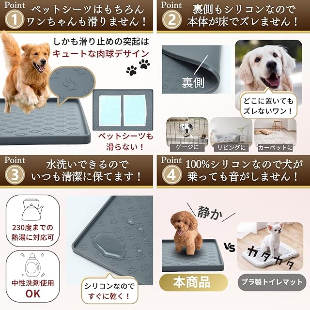 滑らない加工: 密着力が強いシリコンマットは排便パッドを乗せても散らばる心配が無く便利です。