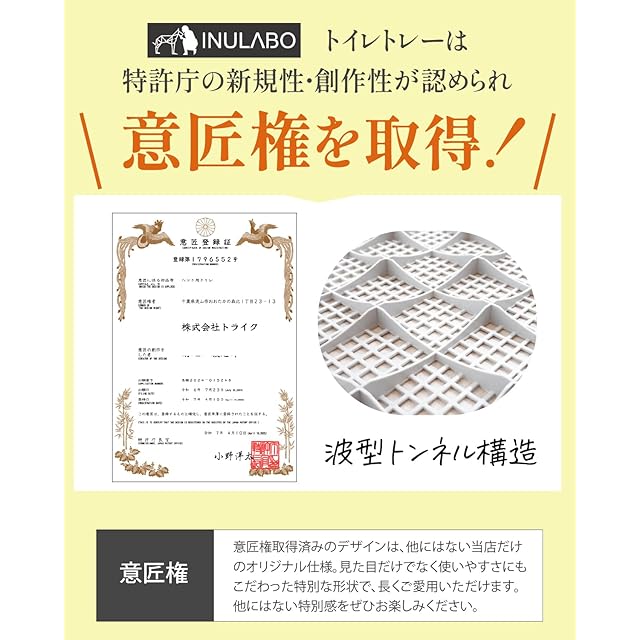 【意匠権申請:波型トンネル構造】波型トンネル構造をメッシュに採用したことで、より頑丈により利便性の高いトイレに進化しました。また、柱になる部分も従来の2倍に増やしたことで、強度が大幅にアップしました。超大型犬でも割れてしまうことはありません。※メッシュの上でジャンプ等しないようにご注意ください。大型犬や多頭飼いの方にも喜んでいただける仕上がりとなっております。
