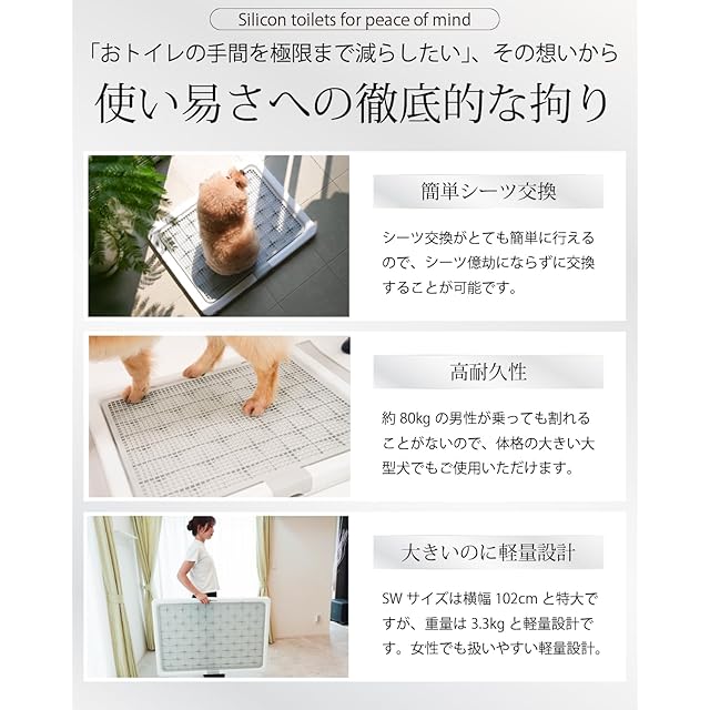 【シーツの交換は1日1回】高床式トイレトレーでは、綺麗好きなワンちゃんでも気にならずに何度でもしてくれるというお声を多数頂いております。特に、1枚につき1回しかしてくれないワンちゃんの場合、高床式トイレトレーをお使いいただくことでシーツの節約につながります。また、お留守番の際にも何度でもしてくれるので役に立ちます。お留守番が多い場合等、是非ご検討ください。