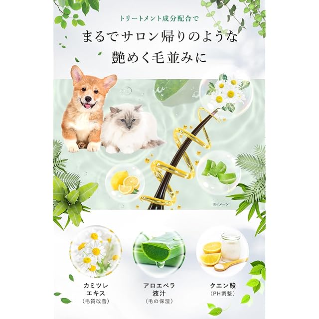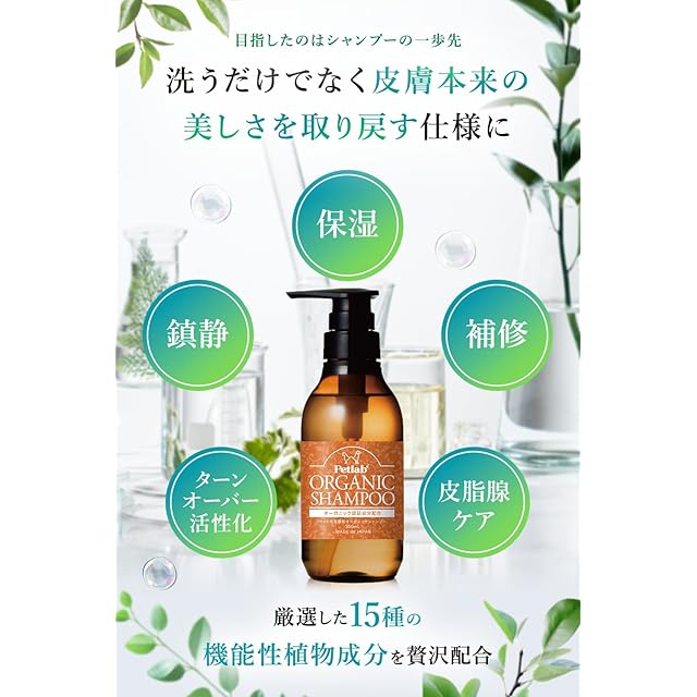 【ご注意ください】品質を保持する為にボトル内圧力調整を行っている関係で、開封時に中身が漏れ出すことがございます。洗面所やお風呂場などでの開封を推奨いたします。 ?【動物看護士×トリミングサロンとの共同開発】PETLABのオーガニックシャンプーは良く使用されている数十種類のシャンプーを試した上で、ワンちゃんの皮膚被毛の健康を保つのに有効な成分を配合しつつ、飼い主様にも快適にご使用いただけるよう、香りや泡立ちなど調整いたしました。 ワンちゃんの皮膚被毛をより健康的に保つための講座動画も同封しておりますので、是非ご覧ください♪ ?【ワンちゃんが嫌がる成分5種無添加】ワンちゃんへの安全を第一に考えた当シャンプーは、皮膚被毛にリスクのあるシリコン、石油系洗浄剤、鉱物油、着色料、合成香料を使わず、ストレスが少ないシャンプー時間になるように仕上げました。 ?【皮膚トラブルを防止する5つのオーガニック成分】数多のオーガニック成分の中から、悩み深い“皮膚トラブル”を予防する為の成分は何か、を考え抜いて選定いたしました。アロエベラ液汁、カツミレ葉エキス、トウセンカ花エキス等、人間用の化粧品に含まれる成分を厳選し、シャンプー本来の汚れ落としの役割だけではなく、ワンちゃんの皮膚被毛の健康を守るための仕様となっています。 ?【独自のW成分で消臭効果もバッチリ♪】植物最強の消臭能力(緑茶カテキンの50倍)を持つ『カキタンニン』を配合しております。同成分は消臭だけでなく厚生労働省が指定する5つの病原菌の不活性化や抗菌作用、のみへの忌避効果もございます。また化粧品にも使われるデオドランド成分『チャ葉エキス』により雑菌の繁殖を防ぎます。