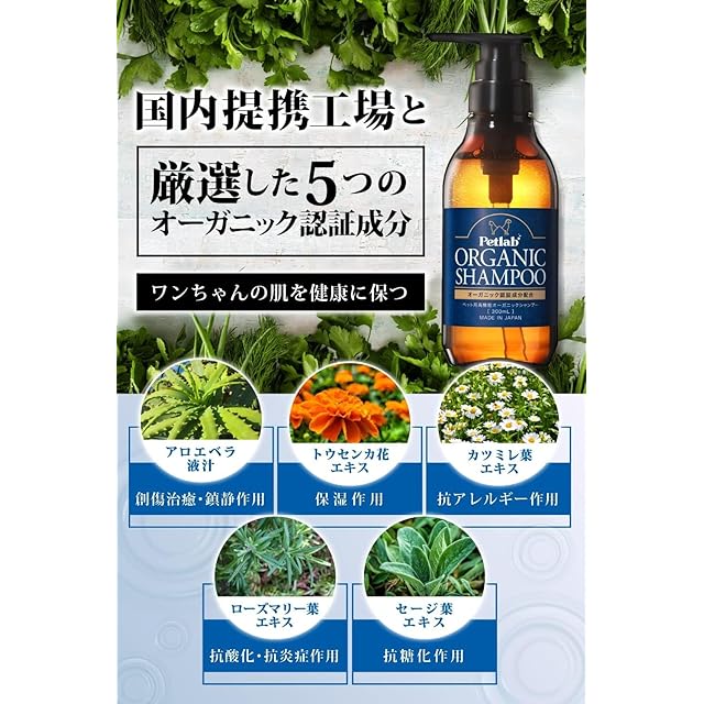 【ご注意ください】品質を保持する為にボトル内圧力調整を行っている関係で、開封時に中身が漏れ出すことがございます。洗面所やお風呂場などでの開封を推奨いたします。 ?【動物看護士×トリミングサロンとの共同開発】PETLABのオーガニックシャンプーは良く使用されている数十種類のシャンプーを試した上で、ワンちゃんの皮膚被毛の健康を保つのに有効な成分を配合しつつ、飼い主様にも快適にご使用いただけるよう、香りや泡立ちなど調整いたしました。 ワンちゃんの皮膚被毛をより健康的に保つための講座動画も同封しておりますので、是非ご覧ください♪ ?【ワンちゃんが嫌がる成分5種無添加】ワンちゃんへの安全を第一に考えた当シャンプーは、皮膚被毛にリスクのあるシリコン、石油系洗浄剤、鉱物油、着色料、合成香料を使わず、ストレスが少ないシャンプー時間になるように仕上げました。 ?【皮膚トラブルを防止する5つのオーガニック成分】数多のオーガニック成分の中から、悩み深い“皮膚トラブル”を予防する為の成分は何か、を考え抜いて選定いたしました。アロエベラ液汁、カツミレ葉エキス、トウセンカ花エキス等、人間用の化粧品に含まれる成分を厳選し、シャンプー本来の汚れ落としの役割だけではなく、ワンちゃんの皮膚被毛の健康を守るための仕様となっています。 ?【独自のW成分で消臭効果もバッチリ♪】植物最強の消臭能力(緑茶カテキンの50倍)を持つ『カキタンニン』を配合しております。同成分は消臭だけでなく厚生労働省が指定する5つの病原菌の不活性化や抗菌作用、のみへの忌避効果もございます。また化粧品にも使われるデオドランド成分『チャ葉エキス』により雑菌の繁殖を防ぎます。