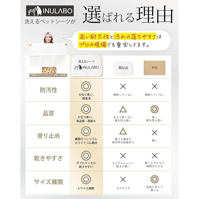 【おトイレがよく見える】 ワンちゃんの排泄物には、病気のサインがいっぱい。INULABOの洗えるシーツは、よく見える真っ白なシートなので、愛犬の変化にすぐに気づくことができます。また、ペット用品の多くは実用性にばかり着目され、デザイン性を軽視される傾向があります。INULABOの防水マットは、リビングに敷いても「トイレ感」がない純白に仕上げています。防汚性も抜群なので、お手入れもとっても簡単です。