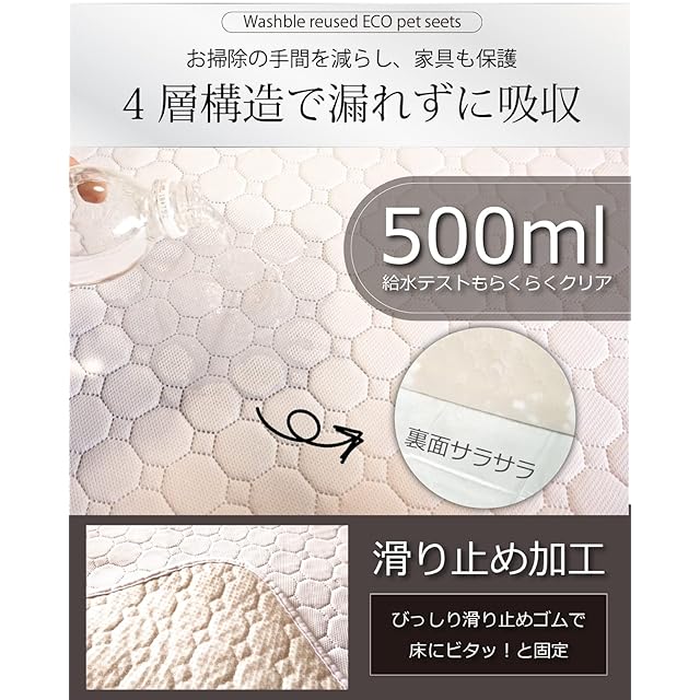 【毎日の大量シーツゴミをゼロに】 洗えるペットシーツ は一般的な使い捨てペットシーツとは異なり、洗って何度でも繰り返し使えるので、地球にもとてもやさしいエコシーツです。毎日数枚〜数十枚使っていたペットシーツ、洗えるので1日1回のお洗濯で済みます。ゴミ出しストレスから解放されます。一般的なシーツ同様に防水シートなので、床が濡れてしまう心配はありません。ペットシーツの裏面には滑り止めゴムがついているので、防水マットは床にビタッとくっつきズレることはありません。