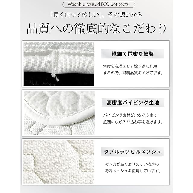 【いつまでも新品のように】 日本企業が品質管理を行っており、メッシュ素材や縫製には非常に強いこだわりを持ち、高品質に仕上げることで、長い間使って欲しいという想いを込めて生産されています。イヌラボの洗えるシーツに使用されているメッシュは「ダブルラッセル」構造を採用。生地にはポリエステルを使用しています。吸収が速い上に、乾燥も早いのが特徴です。何百回と洗濯をしてもヘタレない、抜群の吸収力と速乾性を兼ね備えたシーツに仕上がっています。