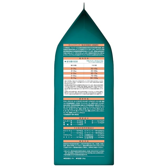 成分:たんぱく質:34%以上、脂質:14%以上、粗繊維:3%以下、灰分8.5%以下、水分12%以下