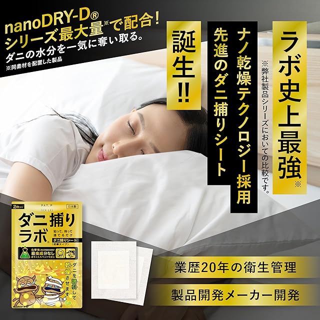 ?従来にはなかった乾燥タイプのダニ捕りシートが新登場!20年以上の歴史がある衛生管理製品開発メーカー開発。独自開発のDNTECH-αと特許出願中のnano-DRY-Dを最大量配合させることで、ダニ捕りシートにダニを大量に誘きよせて一網打尽に。置くだけの乾燥タイプが、水分を多く持つダニに対してより効果的に働きます。化学性殺虫成分を一切利用していないので、子供やペットにも安心安全です。 ?ダニの誘引試験では97.9%のダニの誘引に成功。ダニシートから放たれるDNTECH-αがダニを誘き寄せます。国内ダニトリシートトップレベルの誘引力です。匂いは設置しても気にならない匂いで、日々の生活もストレスフリーで過ごすことが可能です。 ?独自成分のnano-DRY-Dが、ダニを二日で即乾燥。これまでのダニ捕りシートはダニを捕えてもダニが活動し続けることで排泄物や卵を産み、それらが外に出てしまったことも。しかし、乾燥タイプのダニ捕りラボは、80%以上が水分で含まれているダニを乾燥させることで2日で急速に弱体化させます。 ?厚さわずか3.00mmの極薄設計。ポンっと置くだけでダニへの効果は3ヶ月持続。たった5秒もあれば、ベッドや押入れ、ソファなどあらゆる場所でダニ対策が可能です。