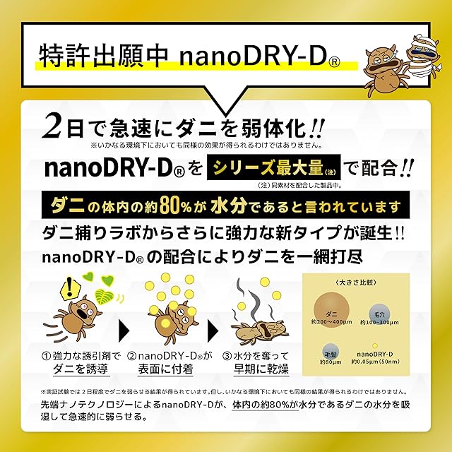 ?独自成分のnano-DRY-Dが、ダニを二日で即乾燥。これまでのダニ捕りシートはダニを捕えてもダニが活動し続けることで排泄物や卵を産み、それらが外に出てしまったことも。しかし、乾燥タイプのダニ捕りラボは、80%以上が水分で含まれているダニを乾燥させることで2日で急速に弱体化させます。