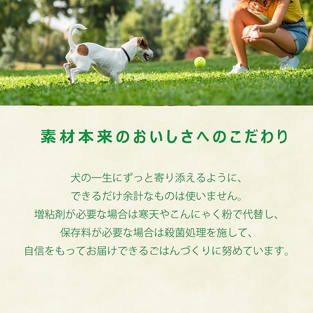 ?【素材本来のおいしさへのこだわり】おいしいごはんは人も愛犬もしあわせにしてくれる・・・そんな理念のもと、おいしい食材をふんだんに使い、食材が本来もっているおいしさを引き出すレシピでつくりました。オイルコーティングはしておらず、着色料や香料といった余計なものは不使用です。