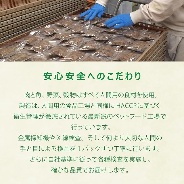 ?【安心安全へのこだわり】お肉や穀類、お野菜は、すべてヒト用の食材です。それを人間用の食品工場と同じ衛生レベルの工場で調理し、品質第一でつくっています。