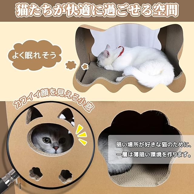 【RAKU】新型猫用爪とぎ 天板2枚付き キャットハウス キャットタワー ダンボールハウス 爪とぎ兼ベッド 猫箱 二階 組み立て式 高密度段ボール 収納簡単 ストレス解消 通気 (2部屋)