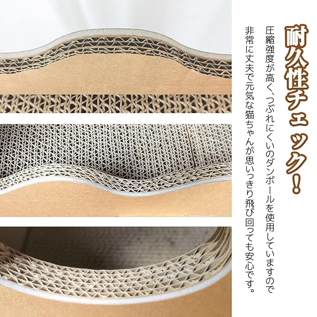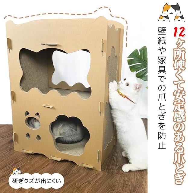 【頑丈なダンボール原料】環境に優しく、猫にとって相性のいいダンボール素材を採用し、高強度段ボールより最高荷重は40kgで、天面は猫ちゃんが乗っても平気なくらい頑丈!只今より取替用天板爪とぎを一枚プレゼントします。 【底部の防水素材】撥水機能は、たまたまの猫ちゃんの尿による損傷を防ぎ、きれいにします。湿った床板に濡れるのを防ぎます。※ご注意:弊社オリジナル商品の為、安い偽物商品にはご注意ください! 【多頭飼いのご家庭にもおすすめです】12箇所硬くて安定感のある爪とぎ付きの猫用ハウス。爪とぎクズも出にくく、お掃除も簡単です。壁紙や家具での爪とぎを防止できます。 【部屋のどこに置いても似合う】もちろんコーナーでも似合います。縦式タイプで部屋の場所をとらない省スペースで、お部屋の隅もピッタリフィットする。