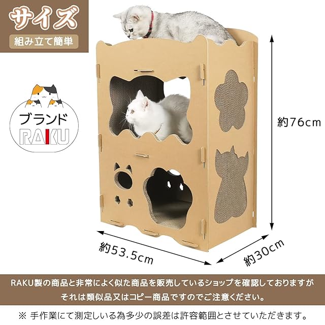 商品名:【RAKU】新型猫用爪とぎ 天板2枚付き キャットハウス キャットタワー ダンボールハウス 爪とぎ兼ベッド 猫箱 二階 組み立て式 高密度段ボール 収納簡単 ストレス解消 通気 (2部屋)