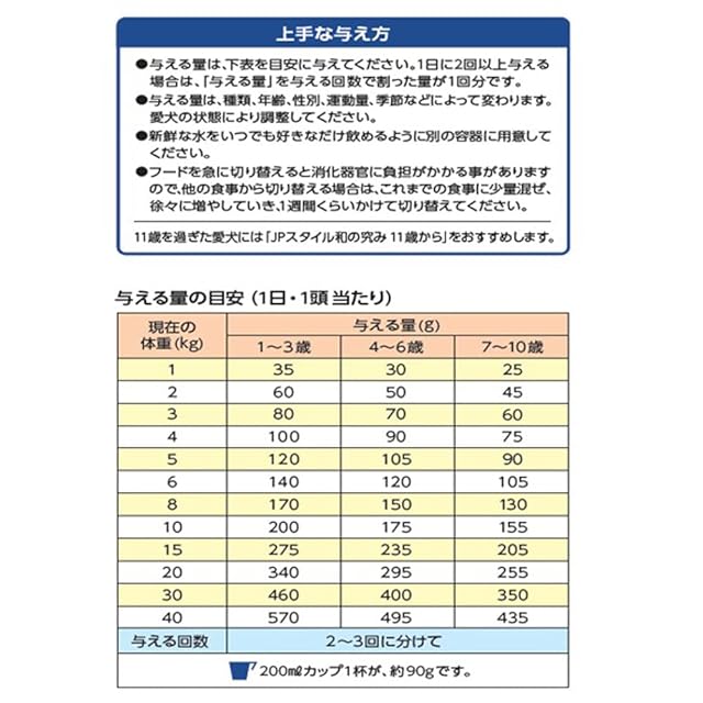 原材料:穀類(小麦全粒粉、米粉、小麦粉、米ぬか、コーングルテンミール、小麦ふすま)、肉類(チキンミール、ミートミール、チキンレバーパウダー)、油脂類(動物性油脂:ビーフオイル、フィッシュオイル:DHA・EPA源)、豆類(おから)、ビートパルプ、糖類(フラクトオリゴ糖)、β-グルカン、セレン酵母、乳酸菌、ビタミン類(A、D3、E、K3、B1、B2、パントテン酸、ナイアシン、B6、葉酸、ビオチン、B12、C、コリン)、ミネラル類(カルシウム、ナトリウム、カリウム、塩素、鉄、コバルト、銅、マンガン、亜鉛アミノ酸複合体、亜鉛、ヨウ素)、酸化防止剤(ローズマリー抽出物、ミックストコフェロール)