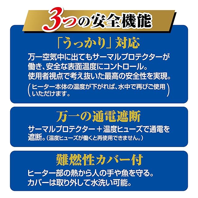 【安全カバー付き】難燃性樹脂を使用したヒーターカバーがついているので、人にも、魚にも安全です。