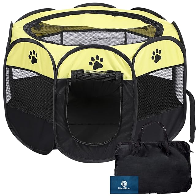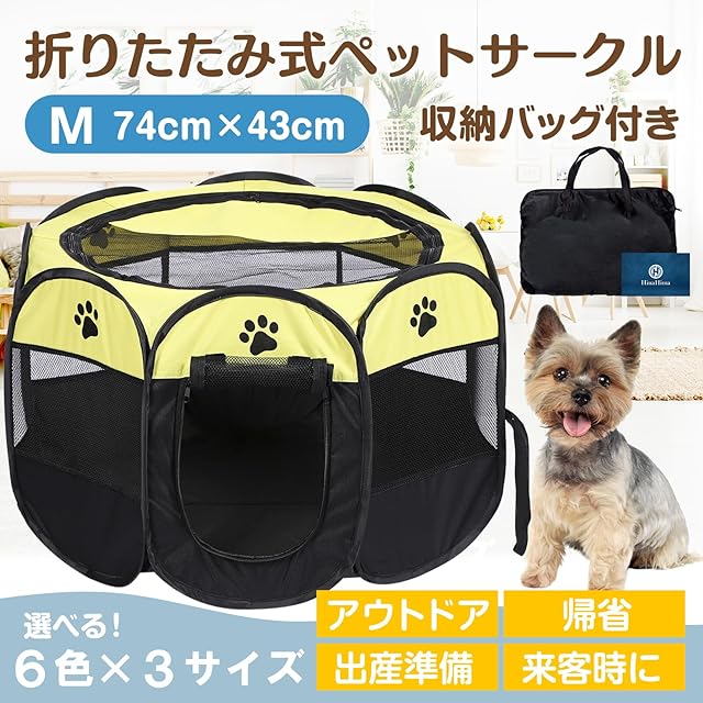 商品名:HinaHima 折りたたみ式 ペットサークル 収納バッグ付き 組み立て不要 猫 犬用 ケージ 幅74cm×高さ43cm (M, イエロー)