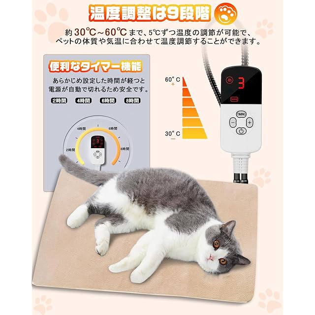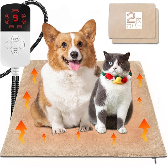 【寒い冬もあったか】 ペット用ホットカーペット 9段階温度調節 ペット用ヒーター 切タイマー 電気ホットマット ペット 犬 猫用 噛みつき防止 防水 過熱保護 丸洗い ふわふわカバー 寒さ対策 45*45cm カバー2枚付き ベージュ
