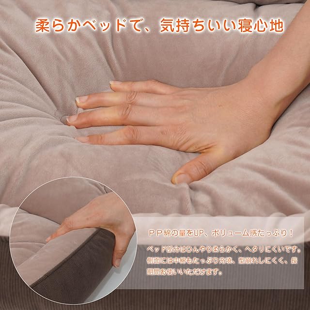 【PP綿の量をUP&気持ちいい寝心地】PP綿の量をUP、ボリューム感たっぷり!ベッド部分はひんやり柔らかく、ヘタリにくいです。側面には中綿もたっぷり充填、型崩れしにくく、長期間お使いいただけます。
