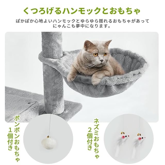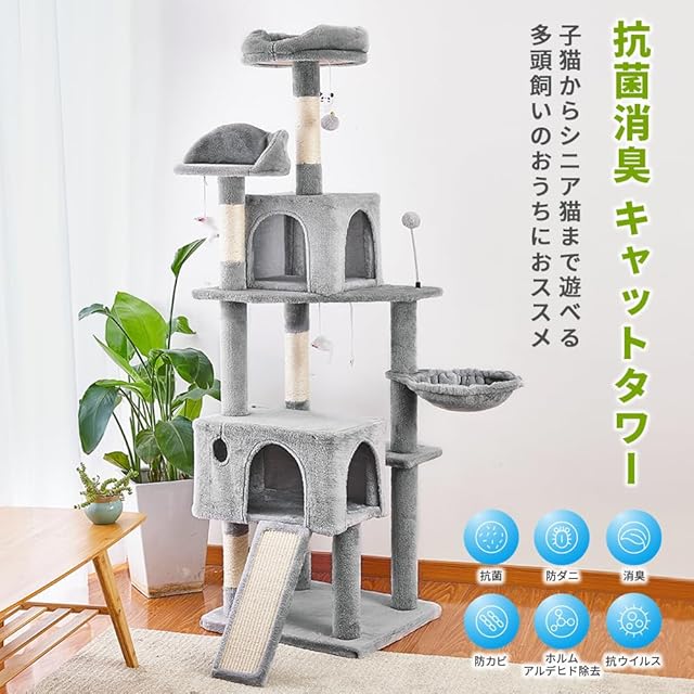 商品名:AIFY キャットタワー 抗菌 消臭 スリム 大型猫 大型 中型 多頭飼い ハンモック おしゃれ かわいい 爪とぎ おもちゃ 猫タワー ねこ 安定 頑丈 爪研ぎ 麻紐 子猫 シニア 省スペース 170cm グレー