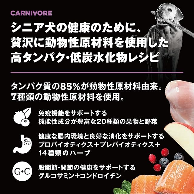 【お肉たっぷりの高タンパク・低糖質フード】タンパク質の85%が動物性原材料を使用。チキン・ターキー・ダックなど7種類のお肉、お魚でシニア犬の健康に。お肉が好き、関節ケアが気になる、筋肉を維持して引き締まった体型を目指したい、多彩な食材から栄養を取りたい、そんなお悩みに。